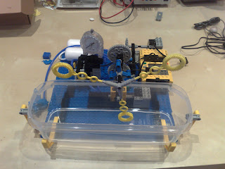 Se redujo también el contenedor que tenia el liquido jabonoso, manteniendo la distancia de las palas. Esto reduce el tener que realizar mucha mezcla jabonosa para el funcionamiento del invento.