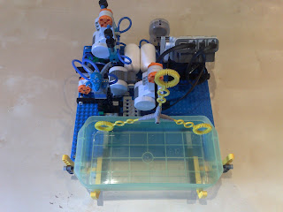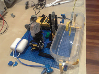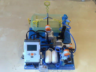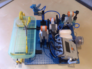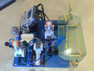 La solución pasaba por usar una nueva versión de los Lego Mindstorms la NTX. Esta version tiene unos motores con encoders mucho mas potentes que la versión anterior, con lo cual se podía utilizar unos pumps mas grandes para comprimir el aire (los azules en la foto inferior).