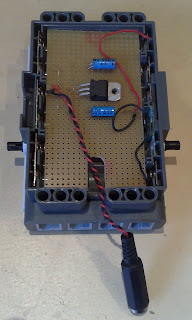 A la hora de funcionar otro problema que nos encontramos fue el consumo eléctrico del conjunto. Funcionando en un régimen normal, llegaba a consumir una media de 300 mA/h. Esto con las pilas por defecto de la versión NXT, hacia que la autonomía fuera reducida. La batería adicional que tiene Lego para los NXT es de 2200 mA/h, por lo que me decidí por otra solución: Realizar una salida estabilizada de alimentación para la CPU del NTX. Esto me permitía fácilmente colocar otro tipo de baterías y/o una alimentación externa.